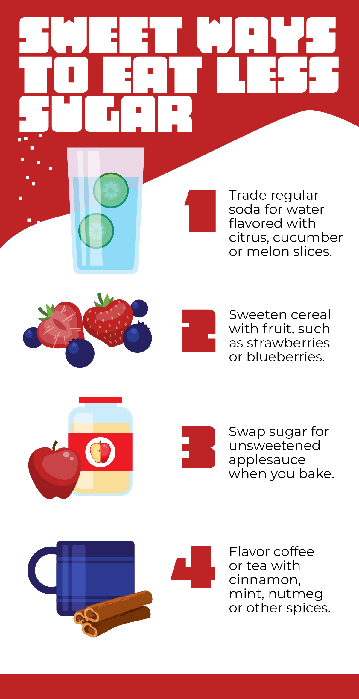 - American Heart Association. "Life is Sweet with These Easy Sugar Swaps Infographic." https://www.heart.org/en/healthy-living/healthy-eating/eat-smart/sugar/life-is-sweet-with-these-easy-sugar-swaps-infographic.