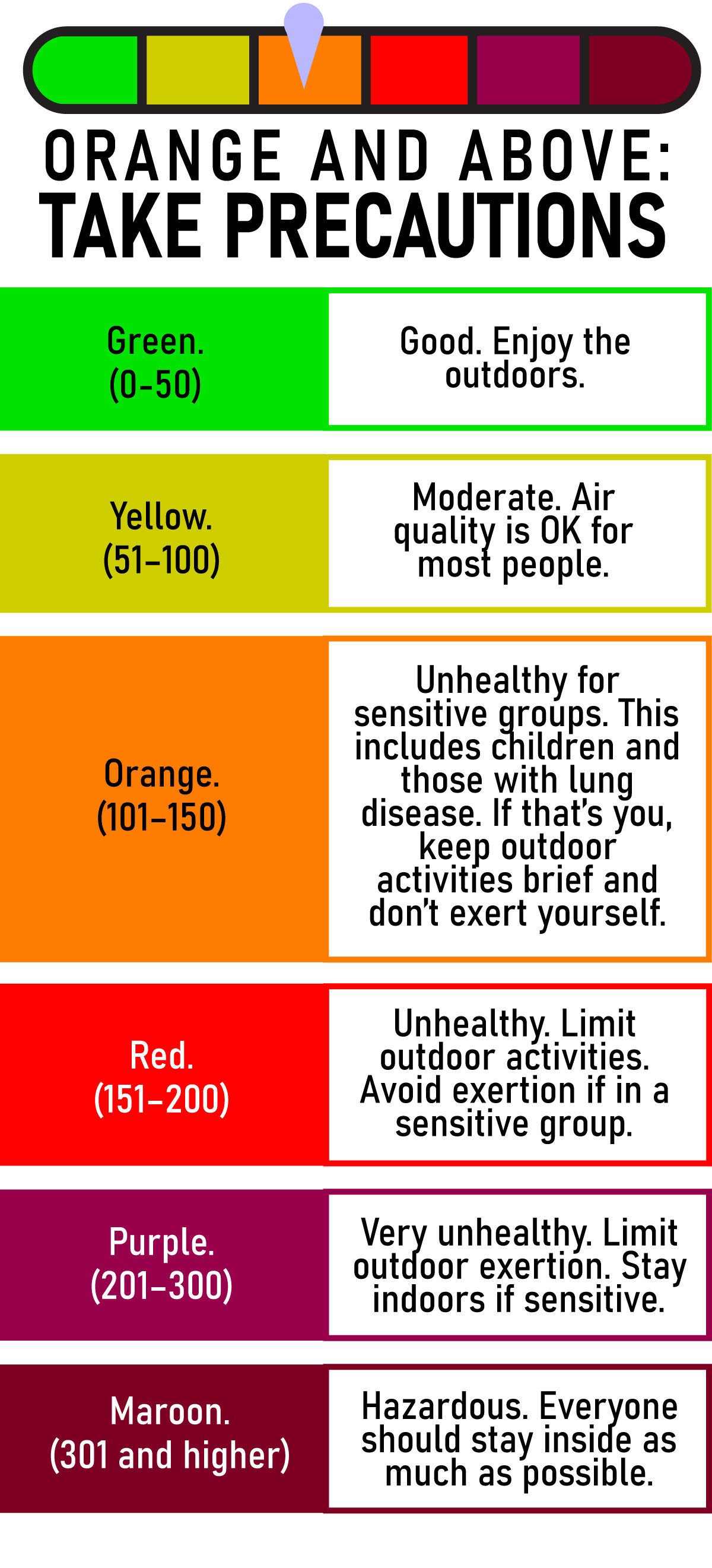 Orange. (101–150) Unhealthy for sensitive groups. This includes children and those with lung disease. If that’s you, keep outdoor activities brief and don’t exert yourself.